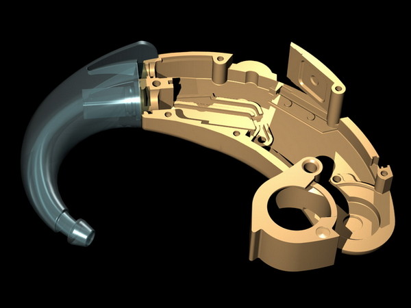 Projekt CAD i wizualizacja obudowy aparatu słuchowego.